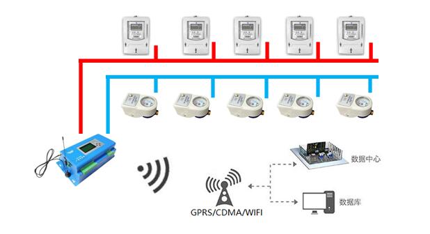 水電表集中安裝的小區(qū):采用有線連接 + GPRS/CDMA 或wifi 的集中采集上傳模式。采集模塊一次可以最多采集32 個設(shè)備的信息,超過的需要增加設(shè)備,GPRS/CDMA 或wifi 將數(shù)據(jù)上傳。